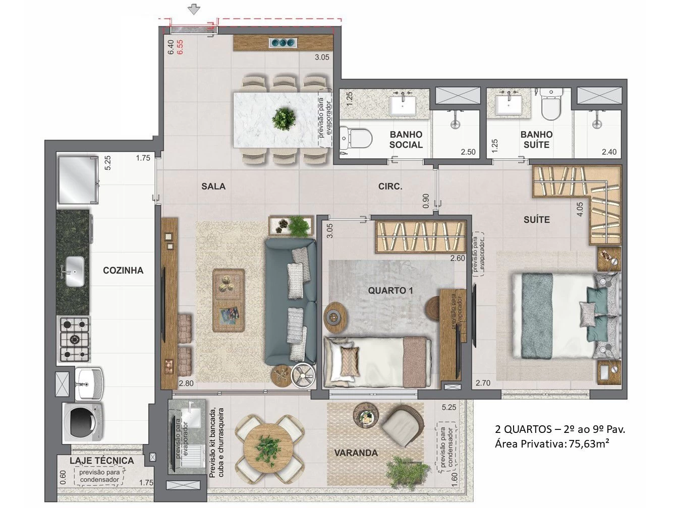 Apartamentos de 2 quartos com 72m² a 75m².